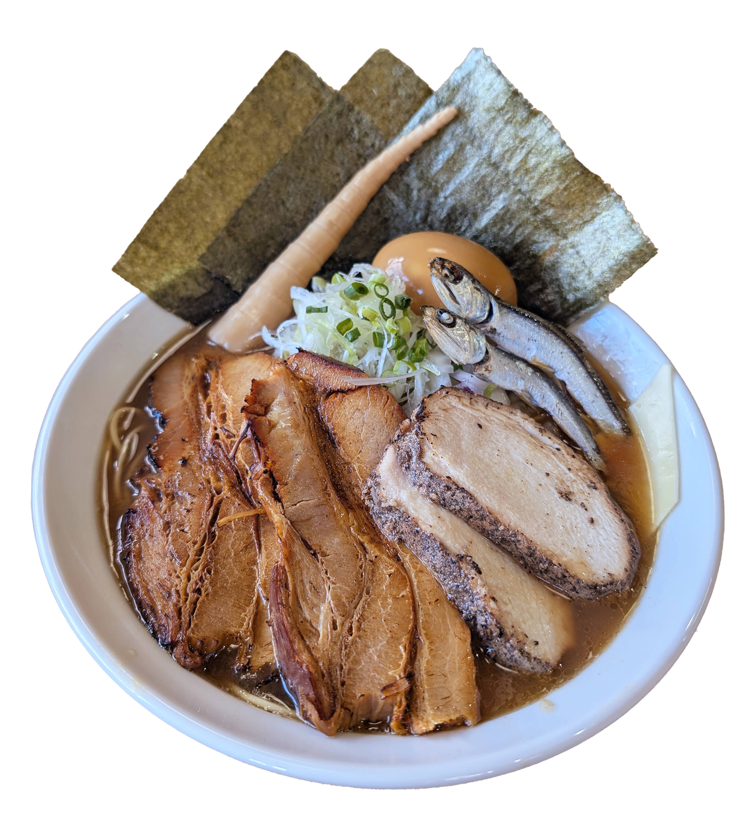 独自の製法で苦みを抑え、煮干しの旨味を最大限に搾り出し、豚骨・鶏ガラの濃度(脂肪) を下げ最後の一滴まで飲み干せる「煮干感は濃厚!でもスッキリ!そしてマイルド!な味わい!!!
